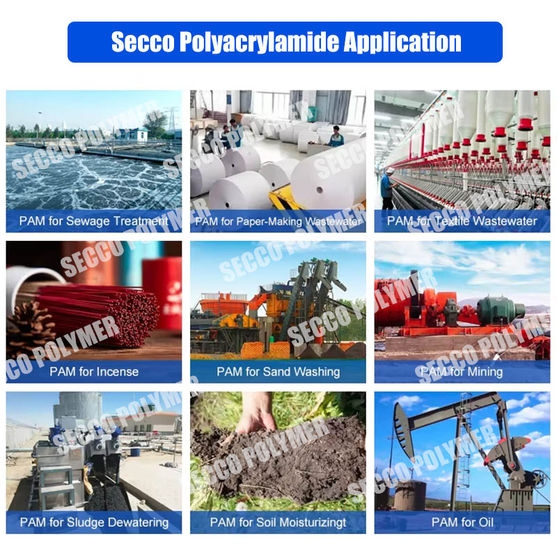 पॉलीअॅक्रिलामाइड इमल्शन विविध प्रकारच्या घरगुती सीव्हेज, रासायनिक सीव्हेज, तेल क्षेत्रातील सीव्हेज, स्लॅम डीव पॉलीअॅक्रिलामाइड वॉटर-इन-ऑयल इमल्शन शहरी सीवेज ट्रीटमेंट, ब्रूअरी, स्टार्च फॅक्टरी, फूड प्रोसेसिंग प्लांट्स आणि इतर सीवेज ट् अम्लीय किंवा अम्लीय अपशिष्ट पदार्थांमध्ये सेंद्रिय निलंबित घन पदार्थांचे फ्लॉक्युलेशन विशेषतः लाग कागद उद्योगात, तो एक धारणा सहाय्य फिल्टर म्हणून वापरला जाऊ शकतो, कागद बनवण्यासाठी सीवेज उपचार. तेल उद्योगाचा वापर ड्रिलिंग इमल्शन कोटिंग एजंट किंवा फ्रीडिंग एजंट म्हणून केला जाऊ शकतो.
